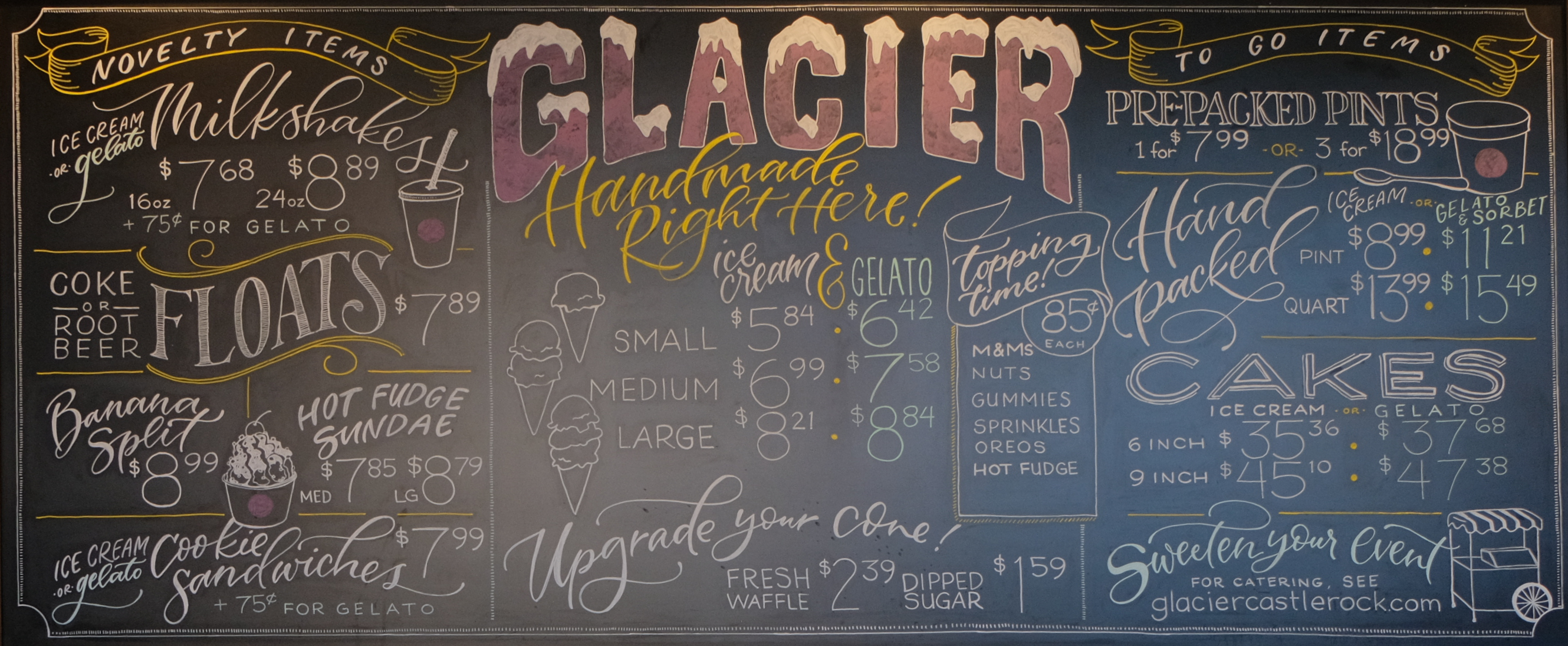 Glacier Homemade Ice Cream and Gelato of Castle Rock serves milkshakes, malts, hot fudge sundaes using our made from scratch caramel and hot fudge, freshly made waffle cones, banana splits, ice cream cookie sandwiches, root beer or coke floats, and custom made to order ice cream cakes!